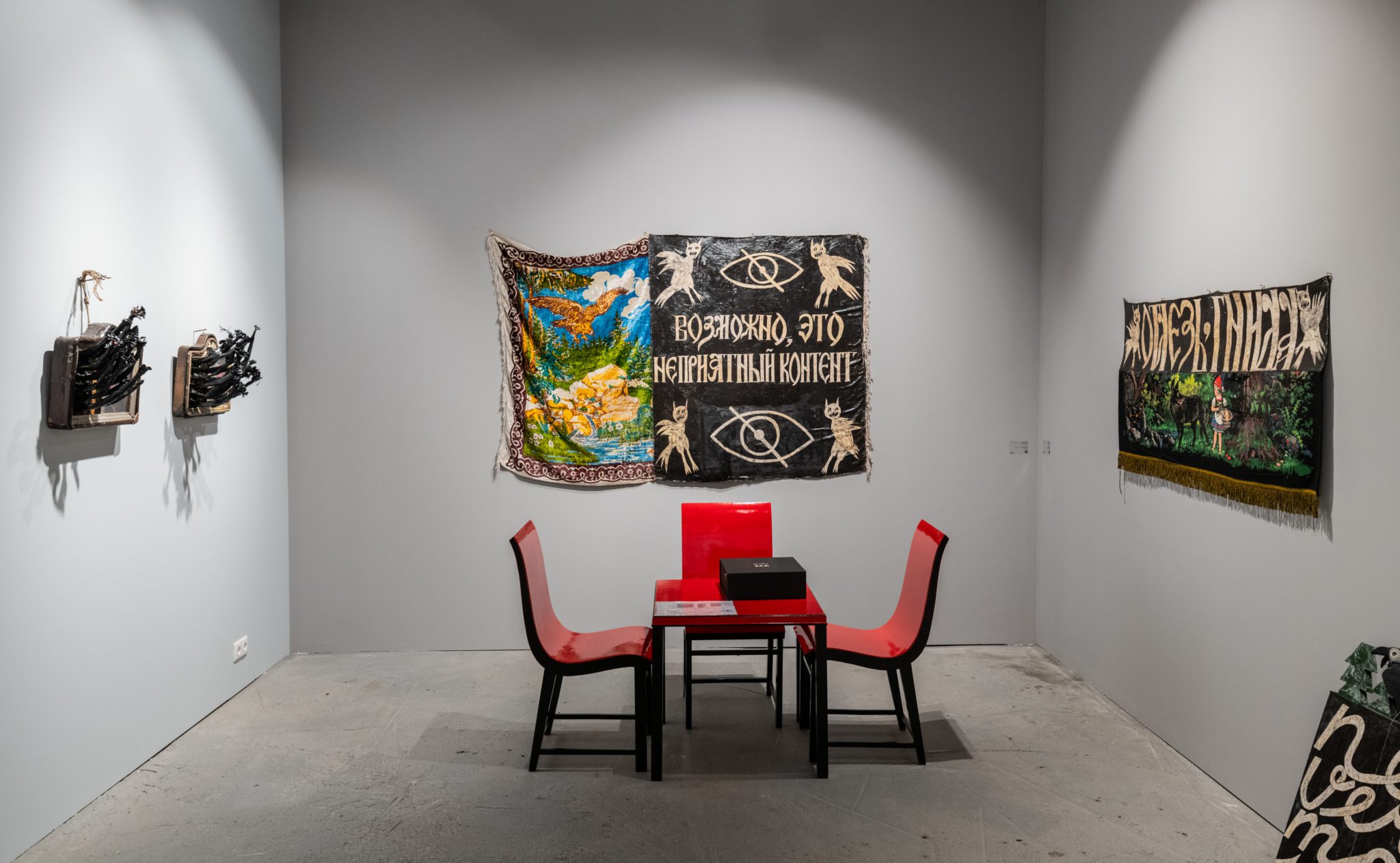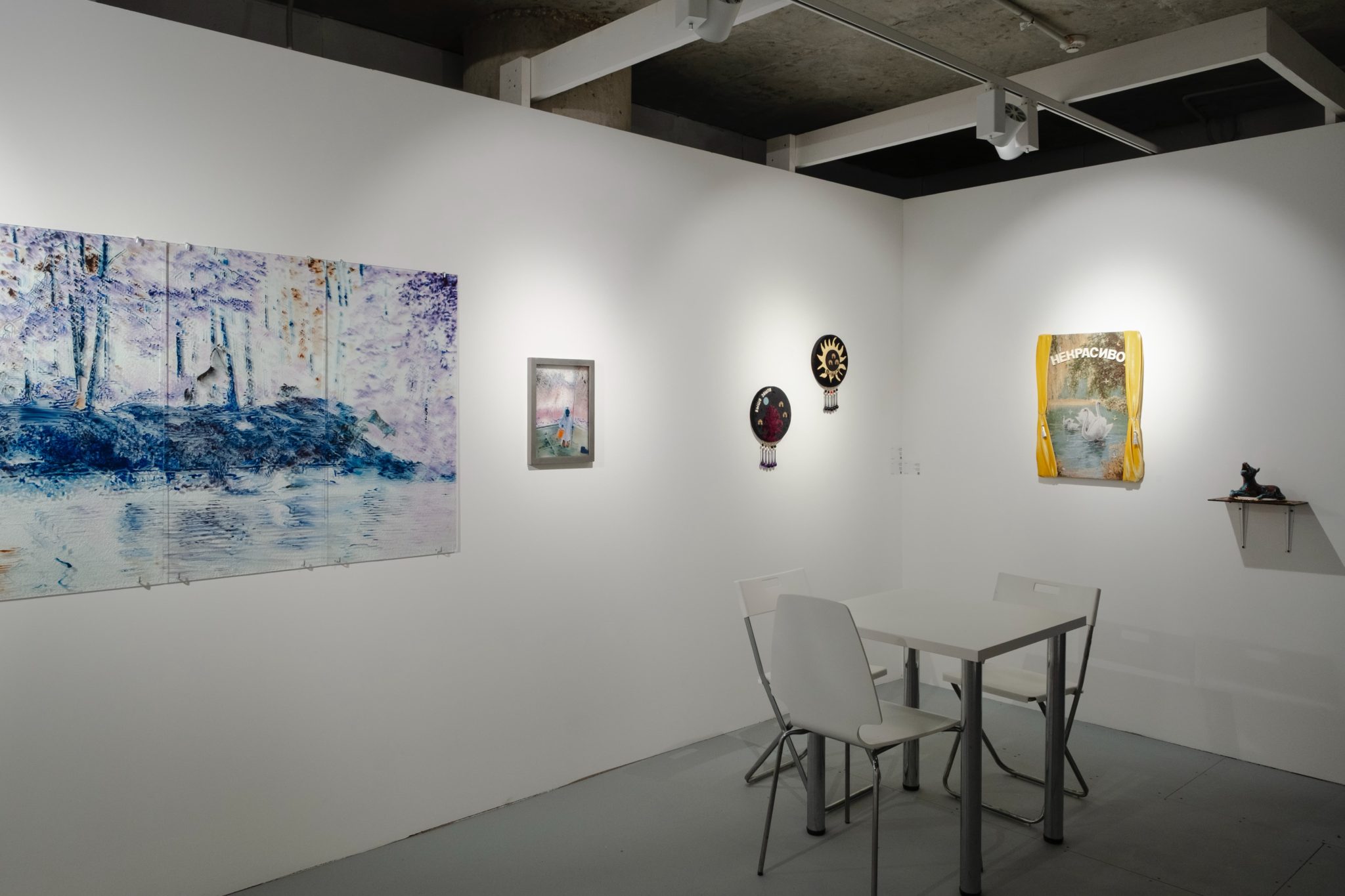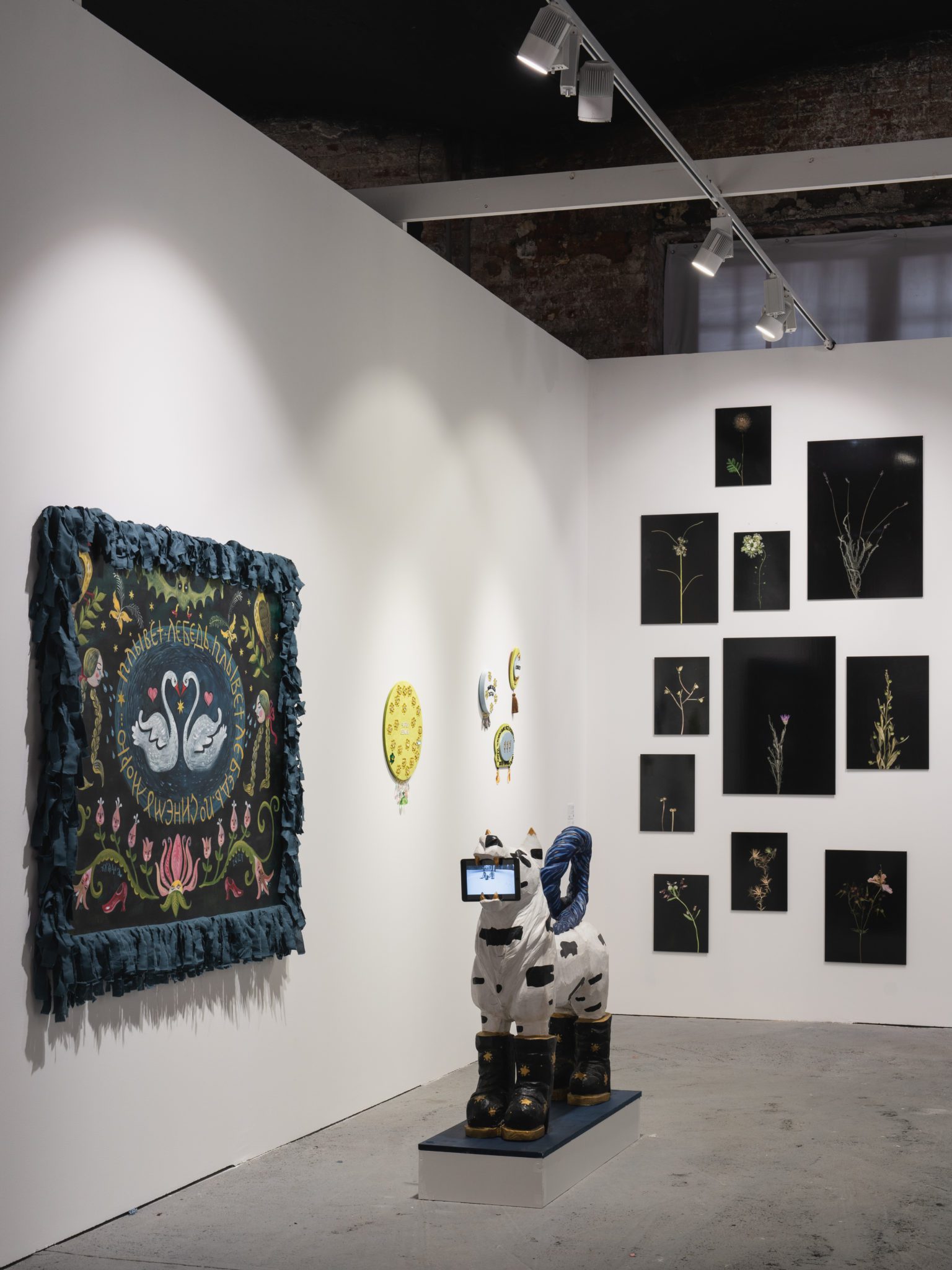Живописные работы Анны Афониной, которые будут экспонированы на стенде, были созданы для выставки «Исключение» (MYTH Gallery, 2022). В их основе изображения, найденные художницей в онлайн сообществах, которые посвящены «инструментальной транскоммуникации» — изучению взаимодействия между этой и потусторонней реальностями, которые, как полагают приверженцы использования этих практик, можно организовать с помощью различных технических средств, радиоприемника, телевизора или воды. Зачастую, такие практики используются для того, чтобы вызвать ушедших близких, и затем предъявить их романтизированный смутный образ общественности. Людмила Баронина будет представлена новыми объектами из серии «Календарь». Художница запечатывает в хрустальные реликварии матрицы печатной графики из этой серии, в которой на каждый месяц — свой конец света. Этот проект Людмилы подобен дневнику, куда записываются пережитые дни, чтобы затем перечитать их и попробовать заново нащупать жизнь. Присущий работам Людмилы юмор представляет собой сальто мысли в пустоту, иронию над неполнотой и невзрачностью жизни, над невозможностью ни изменить этот мир, ни развидеть. Ульяна Подкорытова будет представлена, в том числе, лайтбоксами, созданными для выставки «И просто, и тёмно» (Дом Радио, 2023). Сама идея лайтбокса — произведения, из которого льется свет очень близка Ульяне. Художница своими работами призывает ловить сверкающий луч, укращать и преобразовывать в надежду, которую дает заблудившемуся в лесу путнику, огонек в окне дальнего дома. Эта концепция прослеживается и в сюжете одного из лайтбоксов — сказочные тролли с факелами в руках помогают зрителю выйти из лесной чащи.