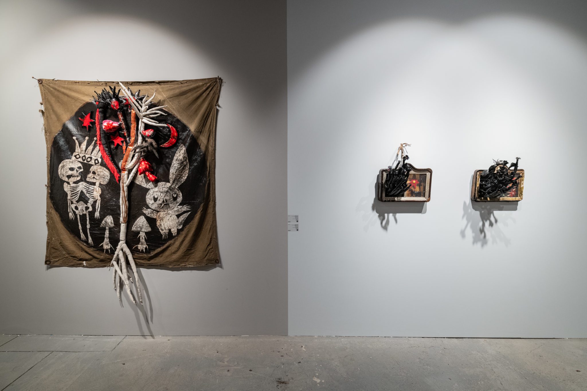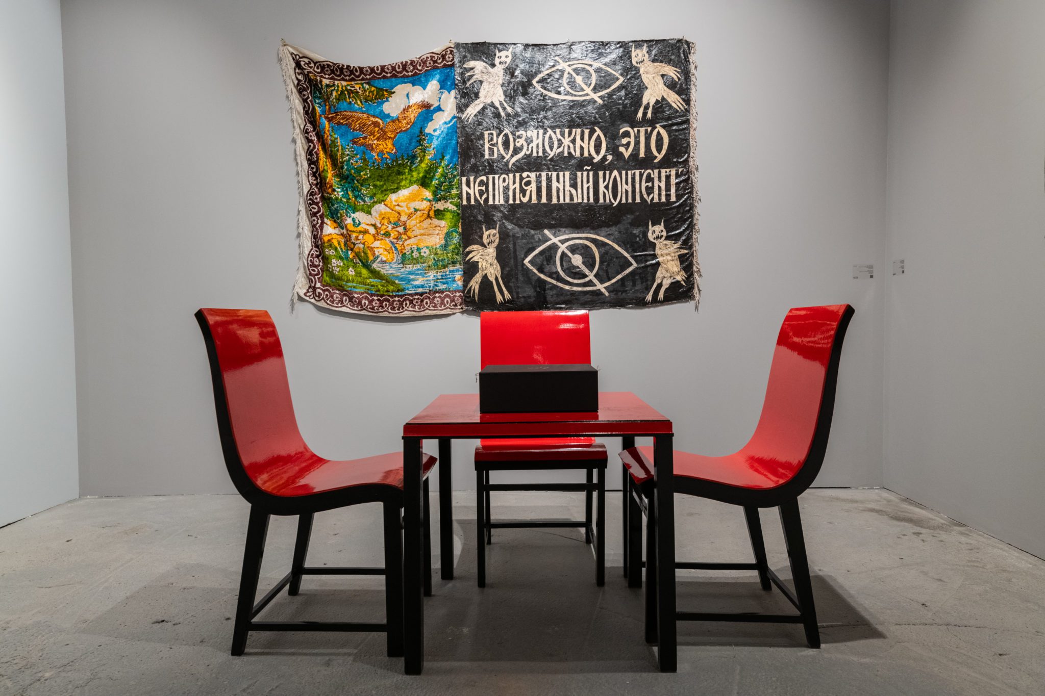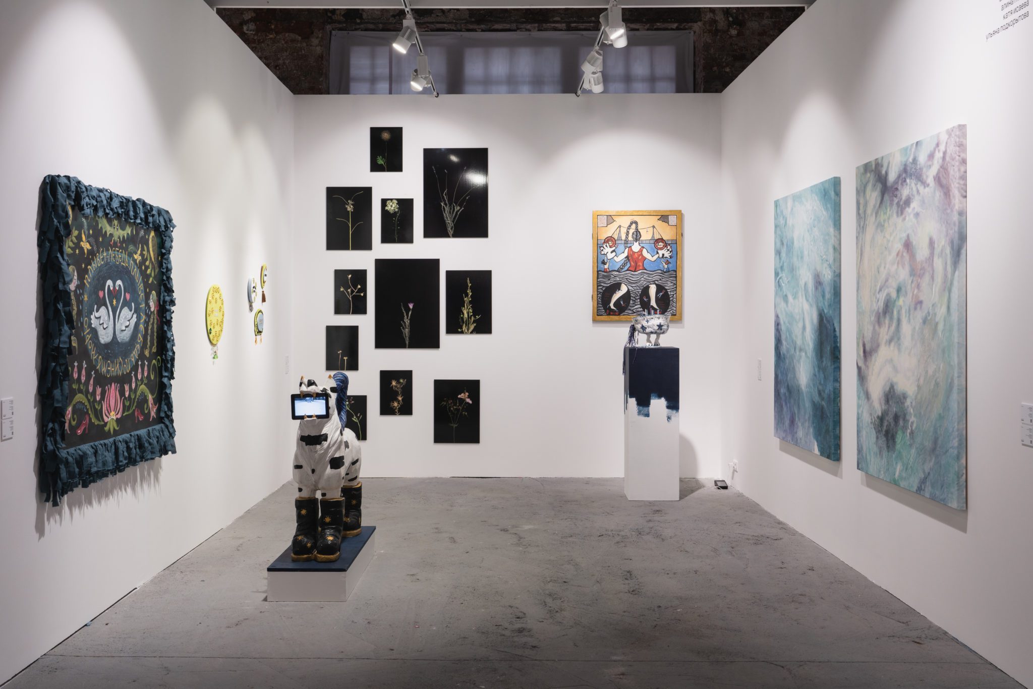 Живописные работы Анны Афониной, которые будут экспонированы на стенде, были созданы для выставки «Исключение» (MYTH Gallery, 2022). В их основе изображения, найденные художницей в онлайн сообществах, которые посвящены «инструментальной транскоммуникации» — изучению взаимодействия между этой и потусторонней реальностями, которые, как полагают приверженцы использования этих практик, можно организовать с помощью различных технических средств, радиоприемника, телевизора или воды. Зачастую, такие практики используются для того, чтобы вызвать ушедших близких, и затем предъявить их романтизированный смутный образ общественности. Людмила Баронина будет представлена новыми объектами из серии «Календарь». Художница запечатывает в хрустальные реликварии матрицы печатной графики из этой серии, в которой на каждый месяц — свой конец света. Этот проект Людмилы подобен дневнику, куда записываются пережитые дни, чтобы затем перечитать их и попробовать заново нащупать жизнь. Присущий работам Людмилы юмор представляет собой сальто мысли в пустоту, иронию над неполнотой и невзрачностью жизни, над невозможностью ни изменить этот мир, ни развидеть. Ульяна Подкорытова будет представлена, в том числе, лайтбоксами, созданными для выставки «И просто, и тёмно» (Дом Радио, 2023). Сама идея лайтбокса — произведения, из которого льется свет очень близка Ульяне. Художница своими работами призывает ловить сверкающий луч, укращать и преобразовывать в надежду, которую дает заблудившемуся в лесу путнику, огонек в окне дальнего дома. Эта концепция прослеживается и в сюжете одного из лайтбоксов — сказочные тролли с факелами в руках помогают зрителю выйти из лесной чащи.
