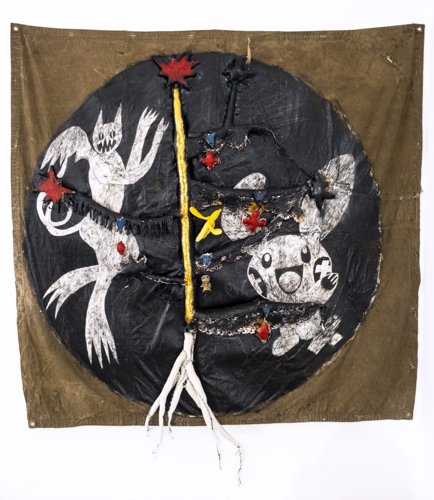 Как и во многих других произведениях художник работает с темой памяти: Вадим выбирает в качестве основы для работы старинный киот, советский ковер или плащ-палатку - все эти предметы так или иначе связаны с воспоминаниями из детства художника.
