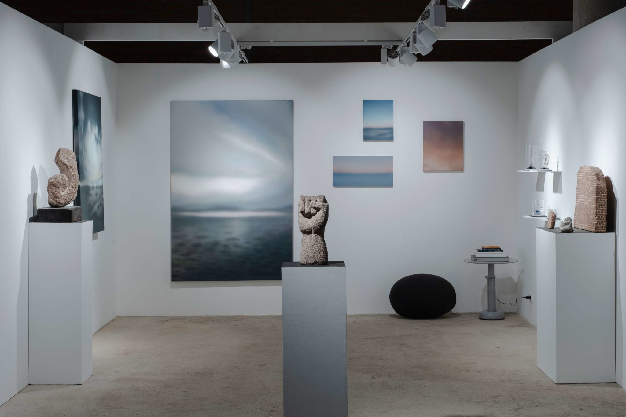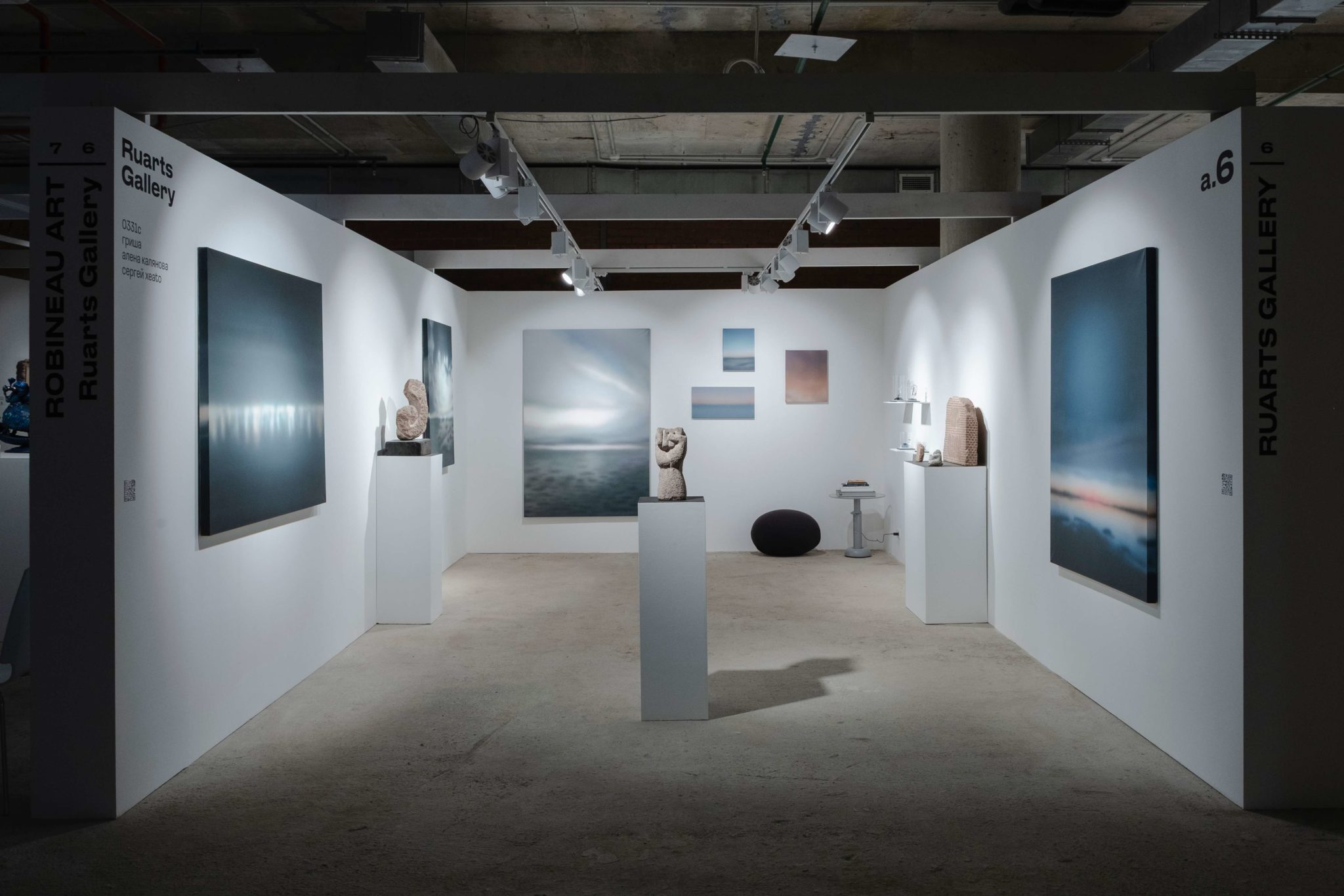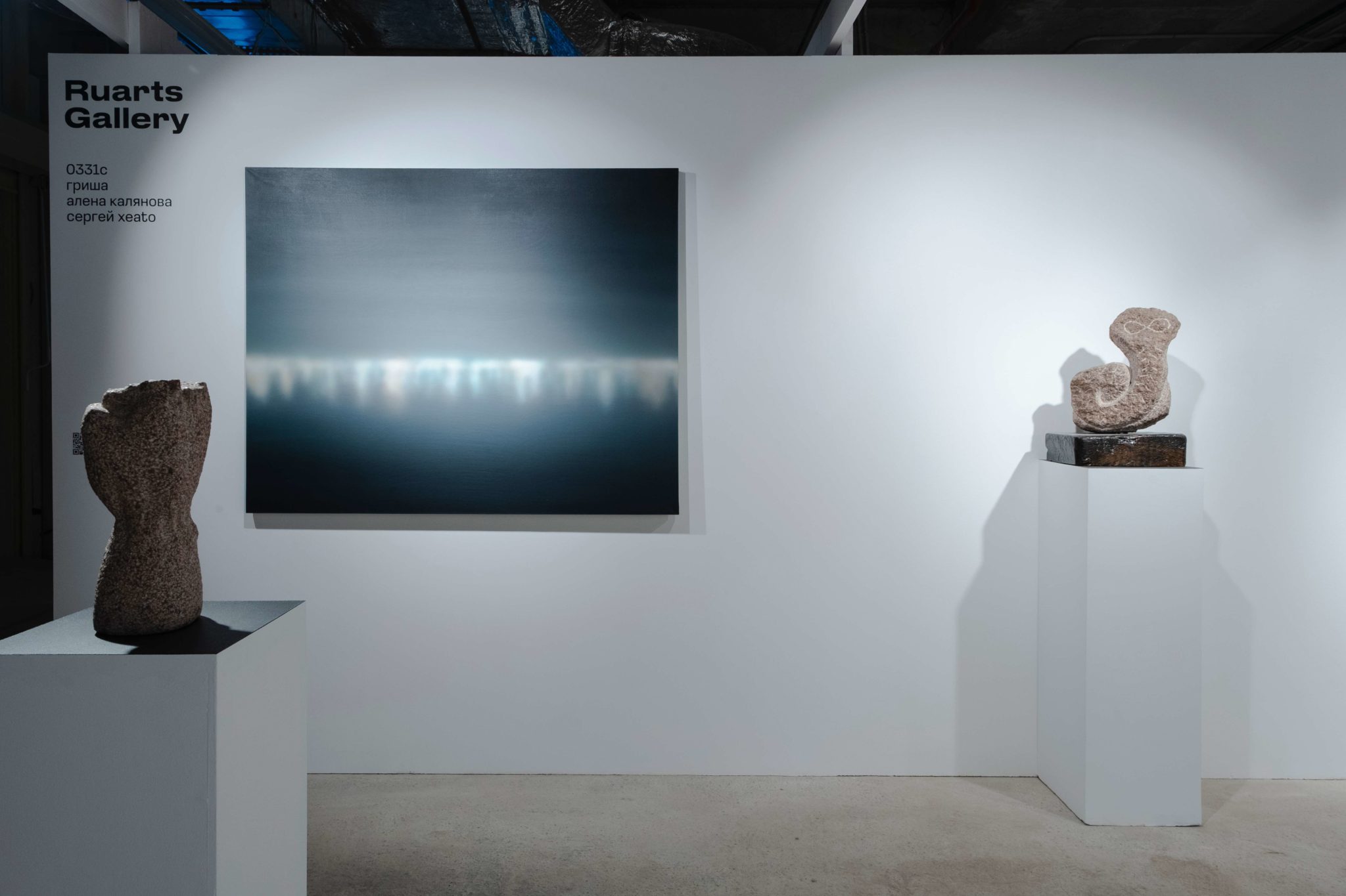 На стенде галереи Ruarts представлены работы Алены Каляновой, 0331с, Гриши и Сергея Хeato. Алена Калянова создает скульптуры – находки своих странствий по метафизическим мирам. Ее объекты причудливых форм, созданные из знакомых нам предметов: флаконов духов, аптечных пузырьков и пружинок, будто бы доставленные с другой планеты, заставляют усомниться в природе открытия. Мы находим чужое, но узнаем в нем себя. 0331с и Гриша обращаются к камню, материалу-летописцу. Их скульптуры с высеченными рисунками — это послания, но откуда и кому? Они кажутся приветом из далекого прошлого Земли или иной цивилизации, чьи символы мы интуитивно пытаемся расшифровать. Это контакт через тысячелетия и световые годы, застывший в камне. Хeato обрамляет космический разговор туманными пейзажами, мерцающими границами между реальностью и воображением. Этот проект о неизвестном, о неуловимой странной связи человека с космосом. Живопись и объекты переносят зрителей в интерстелларное пространство, тем временем современный город лежит внизу, как открытка – молчаливый и холодный.